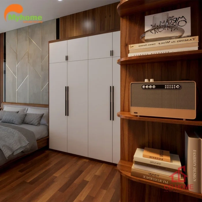 Phòng ngủ được ốp tường vân gỗ sang trọng