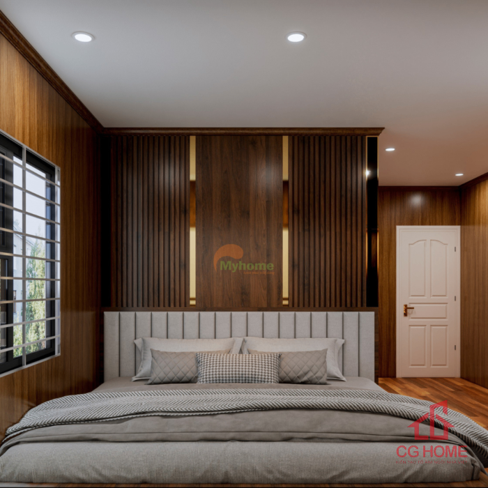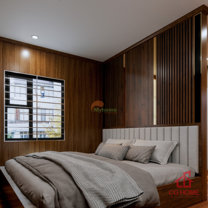 Phòng ngủ hiện đại sang trọng với gam gỗ trầm, mang lại cảm giác ấm áp và thư giãn