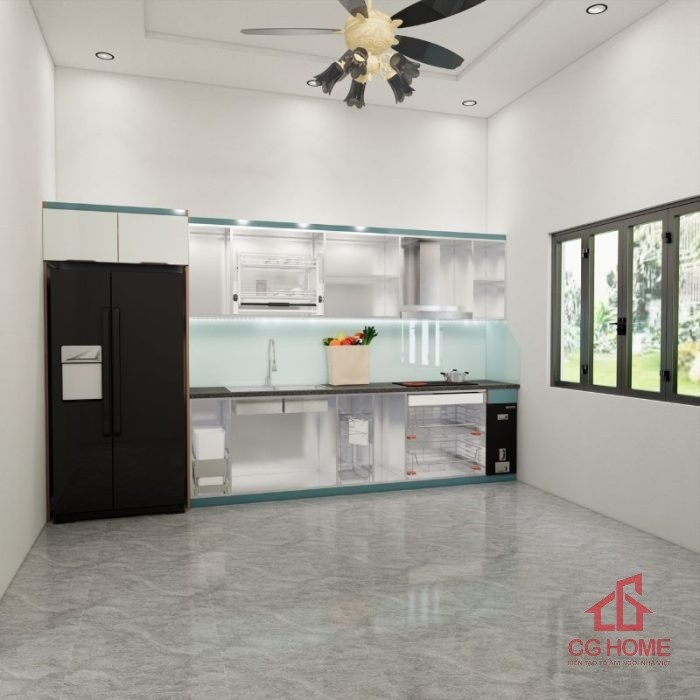 Mặt bằng công năng tủ bếp inox cánh kính 3.9m chữ I