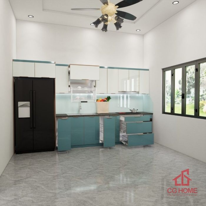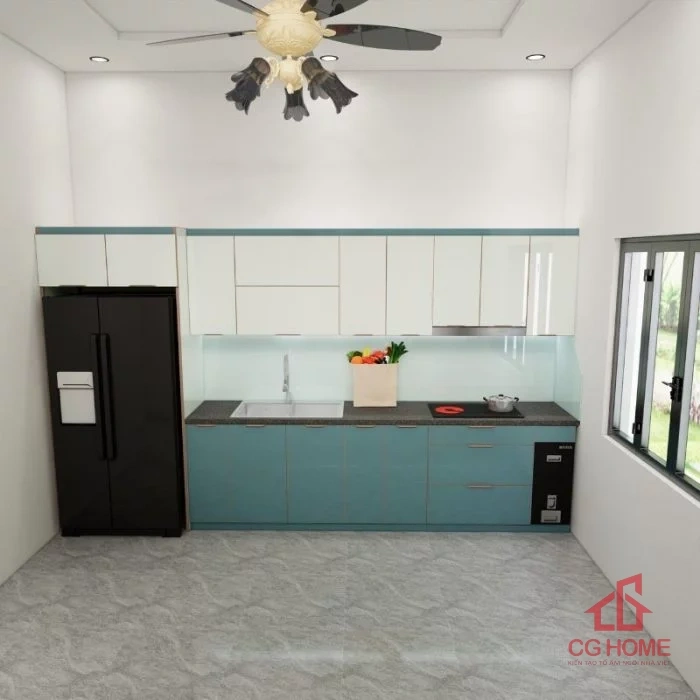 Mẫu tủ bếp inox cánh kính 3.9m chữ I mầu trắng xanh