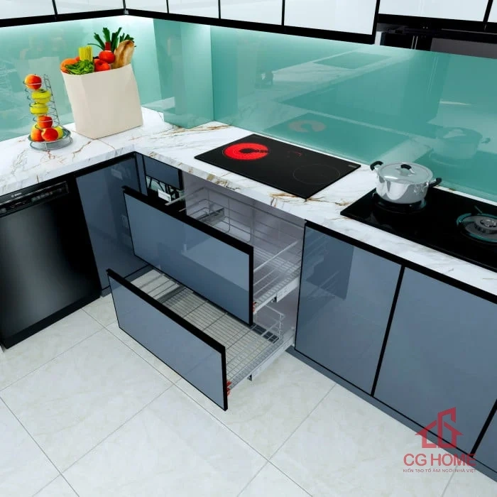 Tủ bếp hiện đại được sắp xếp theo quy trình bếp lý tưởng: Lưu trữ – Rửa – Sơ chế – Nấu – Dọn dẹp. Tủ bếp inox cánh kính Hưng Yên tích hợp phụ kiện tủ bếp như giá bát nâng hạ inox 304, giúp lấy bát đĩa nhẹ nhàng. Kệ xoong nồi 2 tầng và khay chia muỗng đũa giữ đồ dùng gọn gàng. Ngăn kéo ray âm giảm chấn vận hành êm ái, bền bỉ. Hộc tủ đựng rác và máy lọc nước âm tủ tạo không gian bếp sạch sẽ, tiện nghi.
