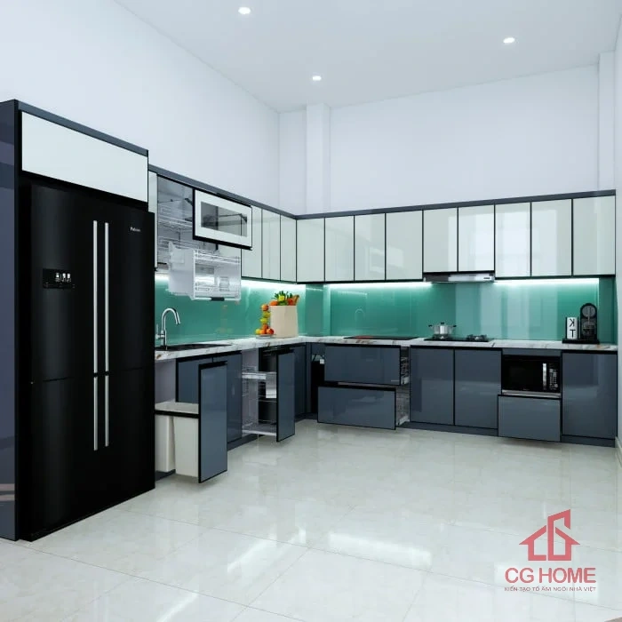 Nội Thất CGHome thi công Mẫu tủ bếp inox cánh kính chữ L3.9*3.6m tại Hưng Yên, Hà Nội, Hà Nam. Hỗ trợ Thái Bình, Hải Dương, Bắc Ninh với đội ngũ kỹ thuật viên chuyên nghiệp. Dự án tiêu biểu: Tủ bếp chữ L 3.9×3.6m tại Kim Động, Hưng Yên, hoàn thiện 8 ngày.