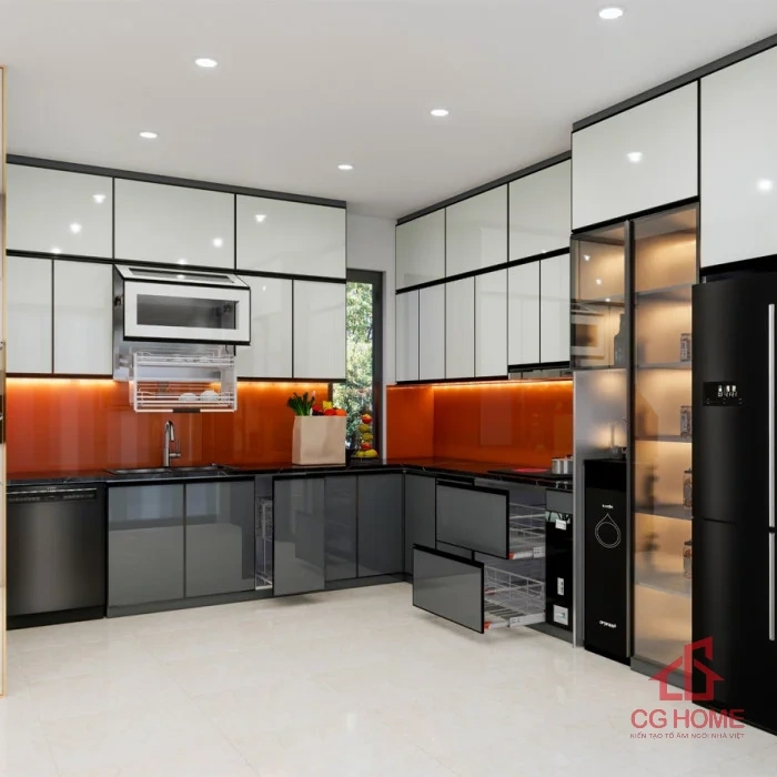 Tủ bếp hiện đại thiết kế theo chu trình bếp chuẩn: Lưu trữ – Rửa – Sơ chế – Nấu – Bày biện. Tủ bếp inox cánh kính Hưng Yên tích hợp phụ kiện thông minh như giá bát nâng hạ inox 304, tiện lợi khi lấy bát đĩa. Kệ xoong nồi 2 tầng và khay chia muỗng đũa tối ưu lưu trữ. Ngăn kéo ray âm giảm chấn đóng mở êm ái, bền lâu. Hộc tủ đựng rác và máy lọc nước âm tủ mang lại sự gọn gàng, tiện nghi cho bếp chữ L.