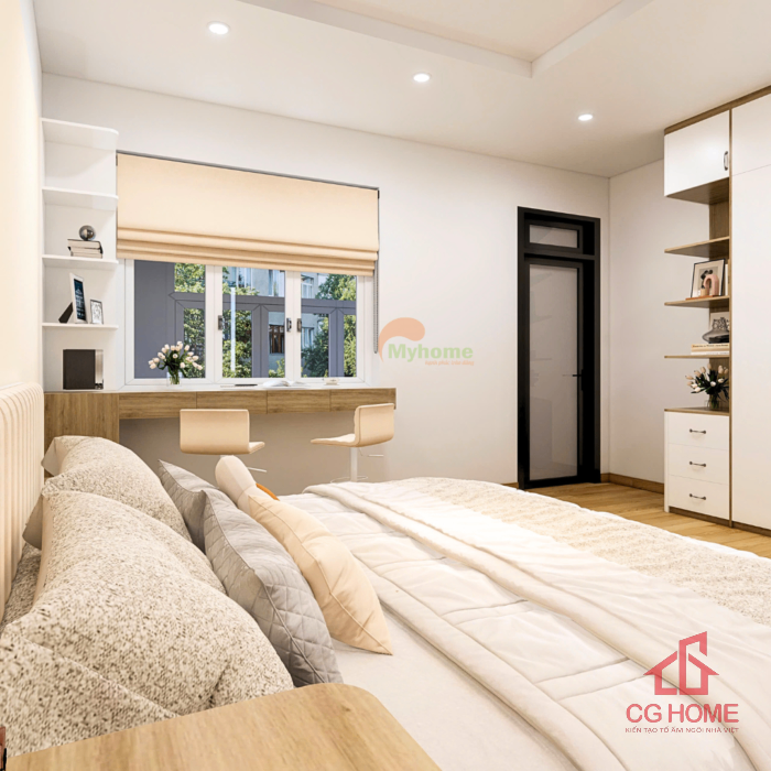 Bàn làm việc bố trí gần cửa sổ, tận dụng ánh sáng tự nhiên và tạo góc sinh hoạt tiện nghi trong phòng ngủ.