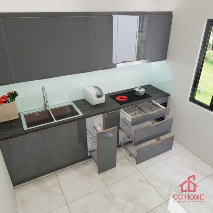 Mặt bằng công năng tủ bếp inox cánh kính 2.9m chữ I