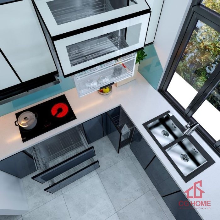 Mặt bằng công năng tủ bếp inox cánh kính 4.6m chữ L