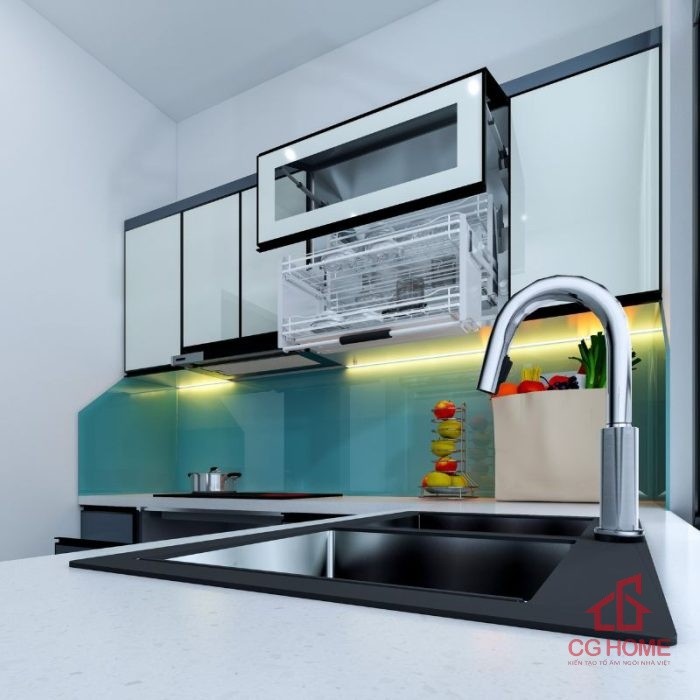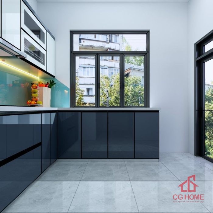 Cánh kính tủ bếp được cấu tạo gồm hai phần. Phần kính cường lực sơn ở ngoài và kết cấu khung nhôm inox đỡ tấm kính.