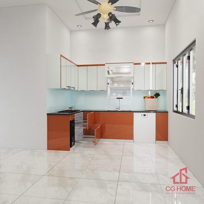 Mặt bằng công năng tủ bếp inox cánh kính 4.7m chữ L