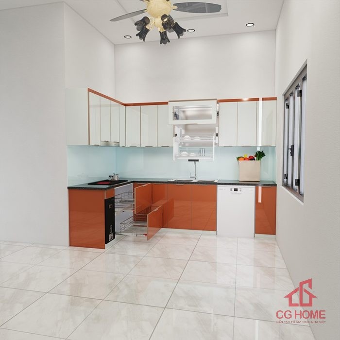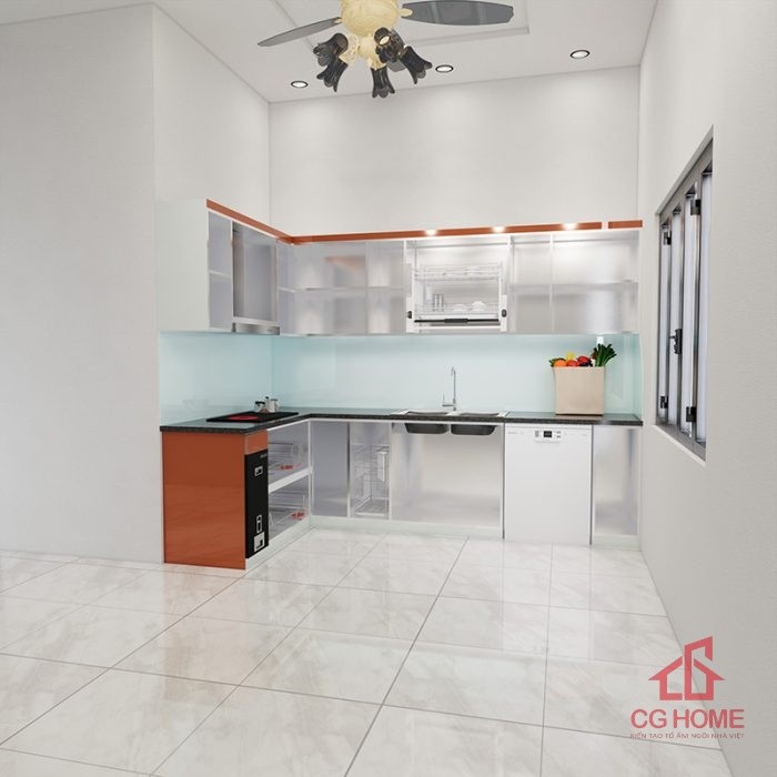 Mặt bằng công năng tủ bếp inox cánh kính 4.7m chữ L