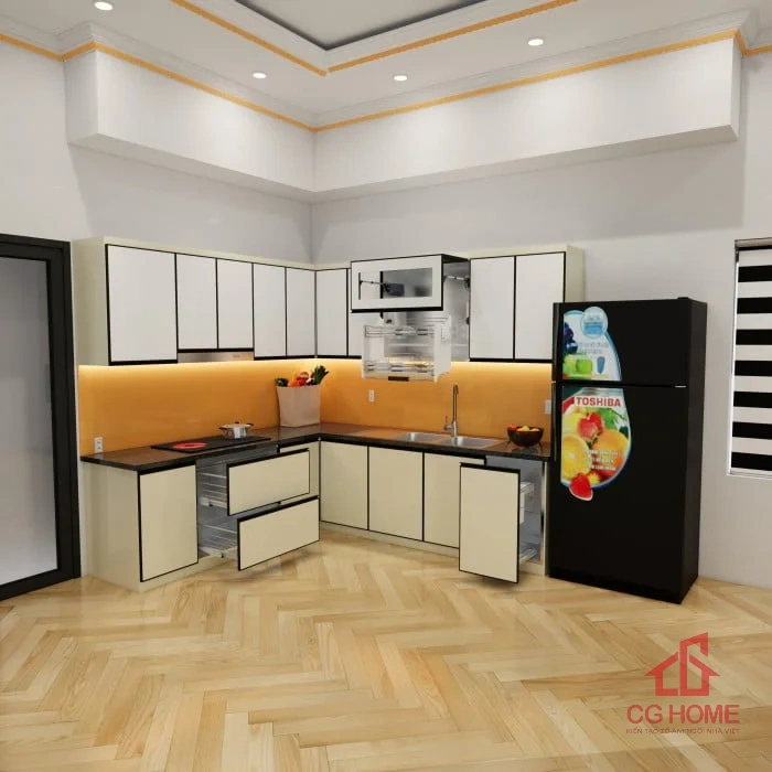 Khung nhôm đỡ kính tủ bếp là một bộ thành phần quan trọng cánh kính tủ bếp. Chất liệu hhôm nội thất sơn tĩnh điện, có độ bền cao, chống xước, chống ăn mòn và không bị bay màu. Màu nhôm cánh kính tủ bếp phổ biến nhất là màu bạc, màu đồng và màu đen. Khung nhôm cánh kính tủ bếp giúp cố định kính cường lực và tạo độ thẩm mỹ cho cánh tủ.