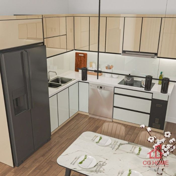 Khung nhôm đỡ kính tủ bếp là một bộ thành phần quan trọng cánh kính tủ bếp. Chất liệu hhôm nội thất sơn tĩnh điện, có độ bền cao, chống xước, chống ăn mòn và không bị bay màu. Màu nhôm cánh kính tủ bếp phổ biến nhất là màu bạc, màu đồng và màu đen. Khung nhôm cánh kính tủ bếp giúp cố định kính cường lực và tạo độ thẩm mỹ cho cánh tủ.