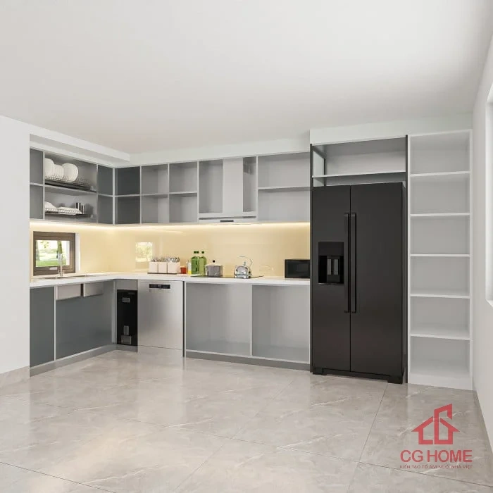 Tủ bếp với tông màu sáng làm nổi bật căn bếp