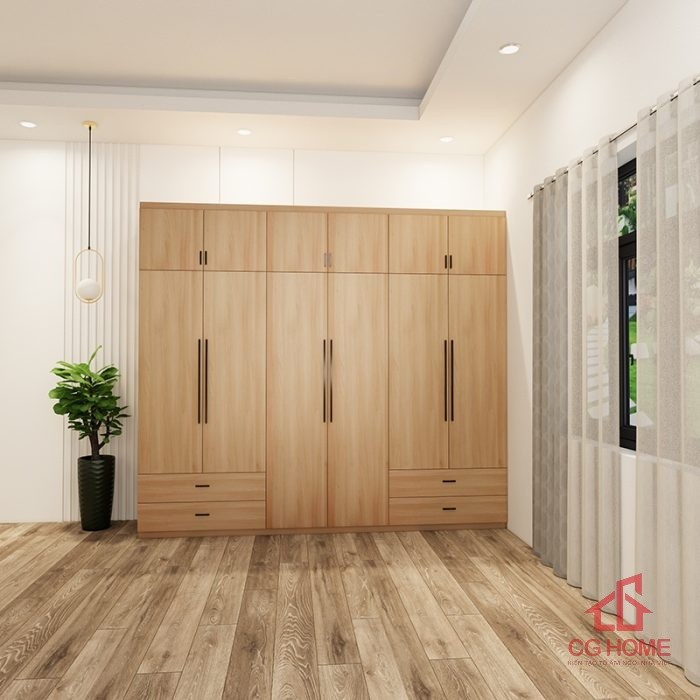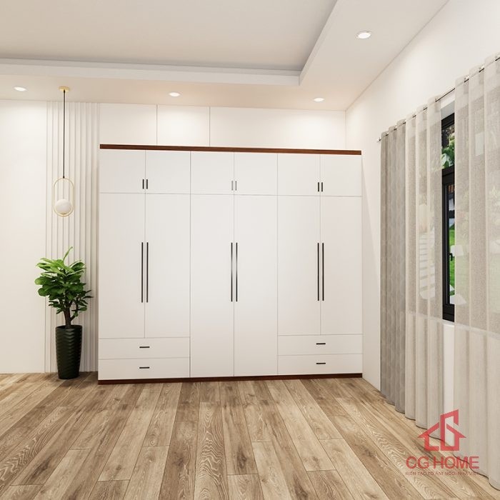 - Tối ưu hóa không gian lưu trữ: Tủ 6 cánh với nhiều ngăn kệ, móc treo giúp bạn sắp xếp quần áo, chăn màn và đồ đạc cá nhân gọn gàng, ngăn nắp, tiết kiệm diện tích phòng ngủ.